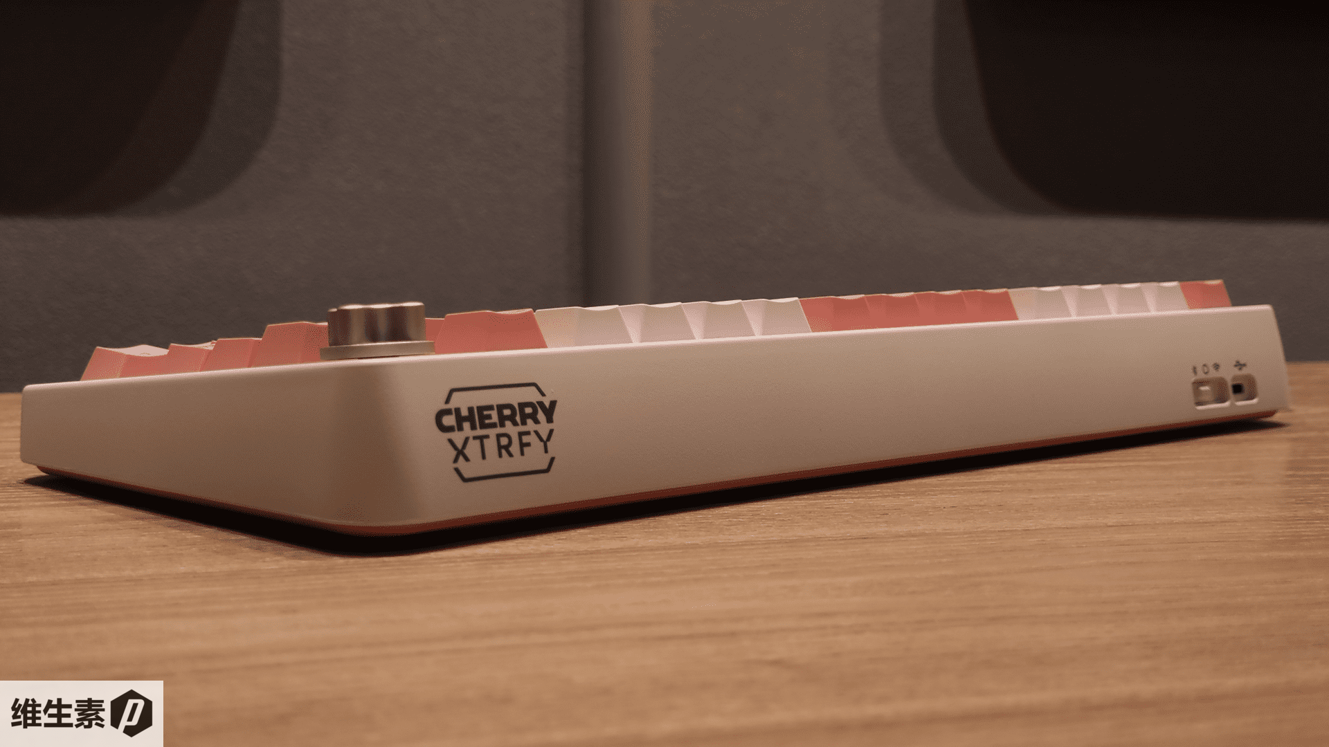 On the top edge, the Cherry Xtrfy logo is symmetrically positioned around the keyboard's side, enhancing its aesthetic coherence. At the opposite end, a Type-C port supports wired connections, complemented by a switch that toggles between Bluetooth and wireless receiver modes. This versatility allows users to seamlessly switch connectivity options based on their specific needs or device compatibility, enhancing the keyboard's utility.