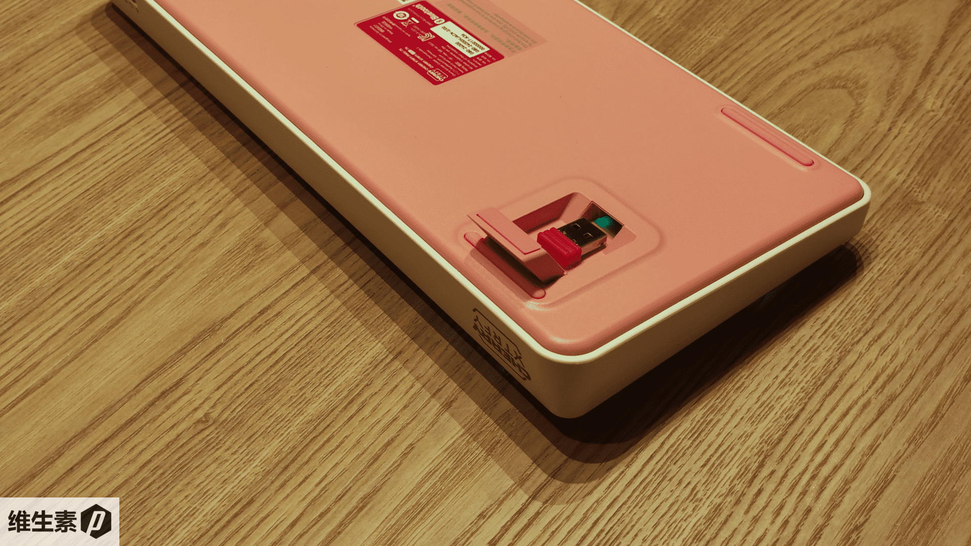 The placement of the wireless receiver is thoughtfully executed. It is ingeniously integrated into the area beneath the keyboard's support stands, which are equipped with a magnetic attachment to secure the receiver. When the stand is retracted, it conceals and protects the receiver, preventing any accidental dislodgement. This design choice ensures that the keyboard maintains a sleek, uninterrupted profile without the intrusion of a protruding USB-A rectangle.