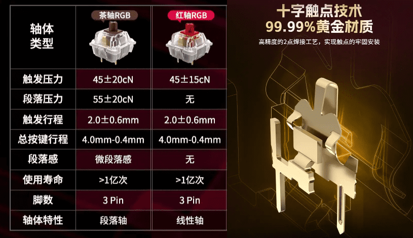 Both of these switches with a 45g actuation force and a 4mm total travel distance. These specifications align with robust, industry-standard designs prevalent in the mechanical keyboard market. Importantly, these switches boast a remarkable lifespan of up to 100 million keystrokes, highlighting their exceptional durability and reliability.