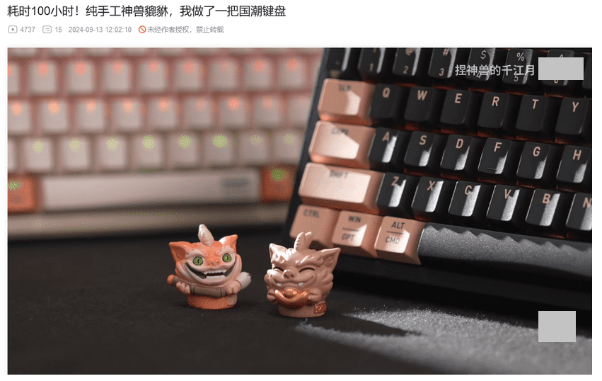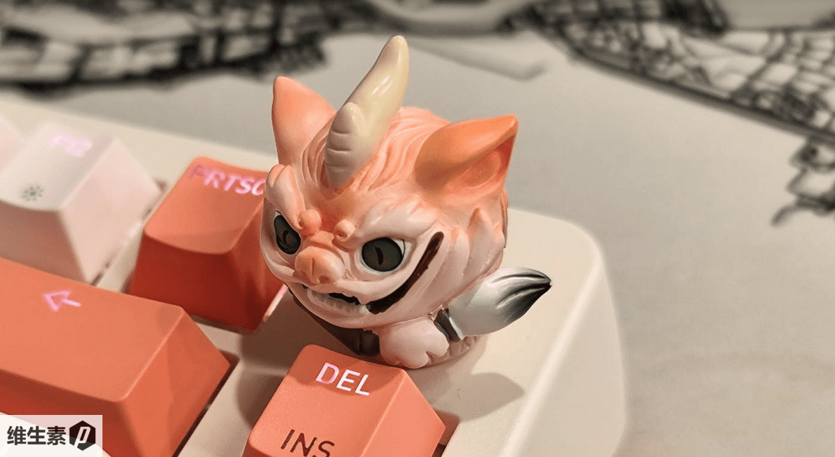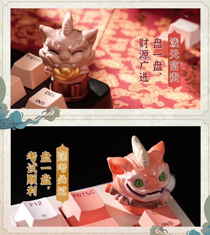 The keyboard I received is equipped with MX2A red switches and features a warm color theme named "HunTianLing" (混天绫). The Pixiu knob is exquisitely crafted, offering a quality feel that harmonizes with the keyboard’s color scheme. The detailing in the horns and fur texture is distinct, and its playful expression, complete with a mischievous smile and a brush in hand, is especially charming.