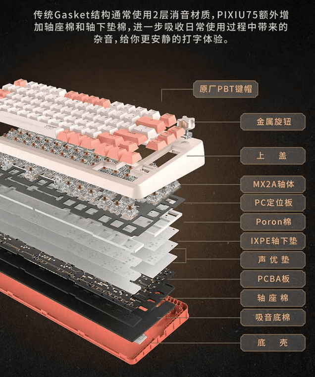 In terms of typing experience, the Cherry Xtrfy PIXIU 75 utilizes a Gasket mount design. The structure inside doesn't use screws to secure the plate but is instead fixed by the upper and lower cases, allowing for better shock absorption and sound dampening, and a softer, more resilient feel.